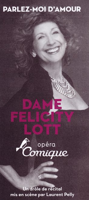 Le (probablement) dernier spectacle de ma saison 2010-2011 fut un véritable enchantement. Dame Felicity Lott (dont j’ai déjà mentionné une fois ou deux le nom en ce lieu…. La première fois que je l’ai entendue, c’était en 1998, à l’Opéra Bastille : elle était la Maréchale face à l’Octavian de ASvO…. tout s’explique !!!) nous a proposé un récital autour de l’amour et composé d’extrait d’opérettes, de musicals et de quelques chansons, essentiellement en français et quelques une en anglais.