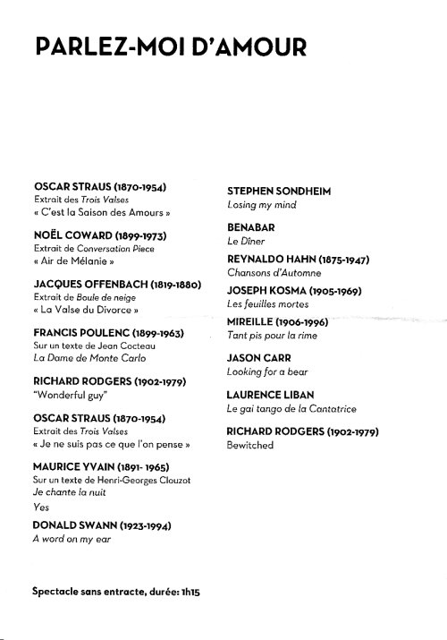 Alors que je commençais à préparer ce billet, j’étais en train de réfléchir au temps que ça pouvait me prendre… Laissez-moi vous répondre ! Beaucoup. Rien que pour chercher des vidéos, trouver une version qui me plait ; s’il n’y a pas l’air recherché, en trouver un qui soit proche ou le bon air, mais chanté par un-e artiste apprécié-e en ces lieux…. ce n’est pas si facile. Pourquoi me casser la tête à mettre des vidéos ? Parce que, à défaut pour vous de m’avoir accompagnée au spectacle, cela me donne l’occasion de vous montrer pourquoi j’aime tel ou telle interprète. Et puis souvenez-vous du vieux slogan de Paris Match : le poids de mots, le choc des photos. Parler musique, c’est bien, mais la faire entendre, c’est mieux. Alors YouTube peut être considéré comme un pis aller, mais si cela vous donne envie d’aller à la découverte d’artistes, de compositeurs ou de genres musicaux auxquels vous n’aviez pas l’habitude, j’aurai atteint un de mes objectifs.